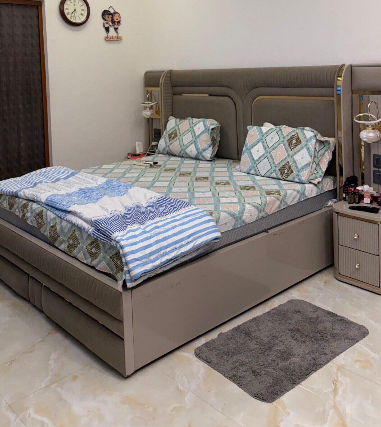 In the bedroom, a serene and tranquil retreat is created through soft taupe or cream walls with a rich terracotta or forest green accent wall behind the bed. The platform bed features integrated drawers to maximize storage without taking up additional floor space, while slim, wall-mounted nightstands and a sliding-door wardrobe with mirrored panels contribute to the minimalist design. Soft linens in white, camel, and dusty rose are layered on the bed to add warmth and subtle contrast. Wall-mounted sconces or pendant lights offer efficient lighting for reading, keeping the nightstands clear.