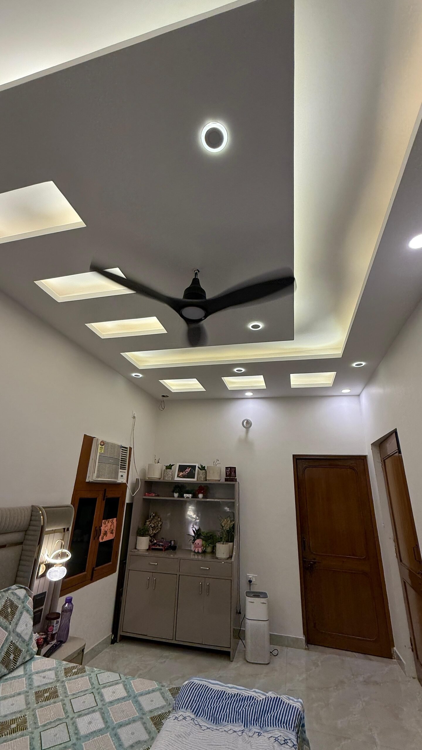 The interior design for this small house focuses on creating a functional, stylish, and modern living environment that makes the most of the available space while maintaining a sense of openness and warmth. The living room is designed to feel expansive despite its size, using matte light gray walls paired with a deep navy or olive accent wall to introduce visual depth. The floor is finished in light oak laminate, which brightens the space and enhances the feeling of openness. The seating consists of a slim-profile, L-shaped sectional in soft beige or slate fabric with low arms and tapered legs, allowing for a seamless flow of space. Storage is integrated with built-in media walls and floating shelves in walnut or black metal, providing both practical storage and an opportunity to display art or plants. Layered lighting, including recessed ceiling lights, a statement arc floor lamp, and hidden LED cove lights, adds both function and ambiance.